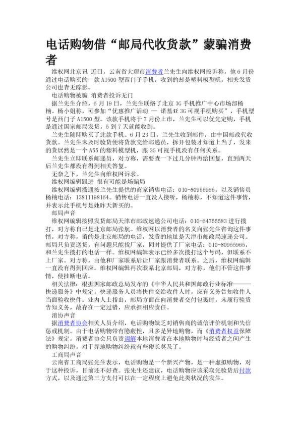 電話(huà)購(gòu)物借“郵局代收貨款”蒙騙消費(fèi)者