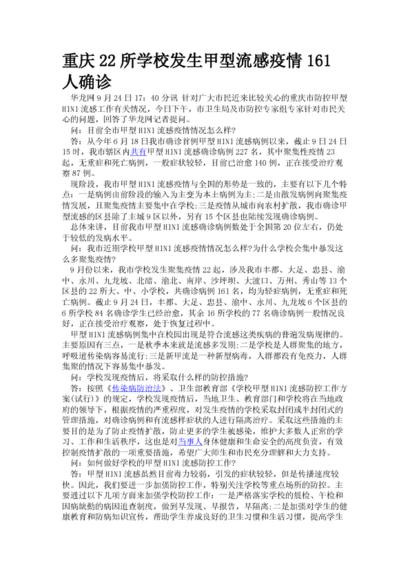 重慶22所學(xué)校發(fā)生甲型流感疫情161人確診
