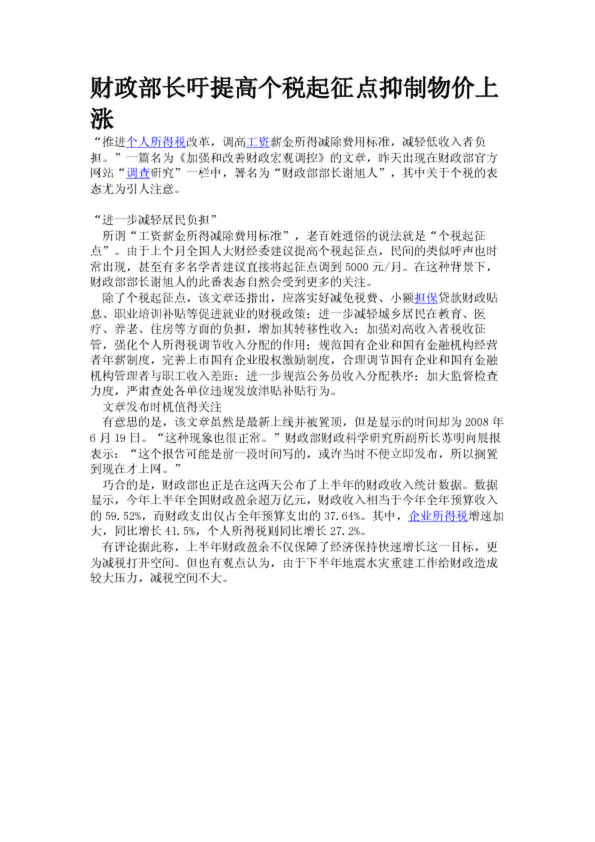 財(cái)政部長吁提高個(gè)稅起征點(diǎn)抑制物價(jià)上漲