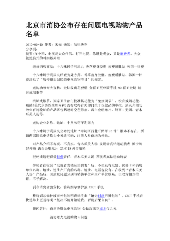 北京市消協(xié)公布存在問題電視購物產(chǎn)品名單
