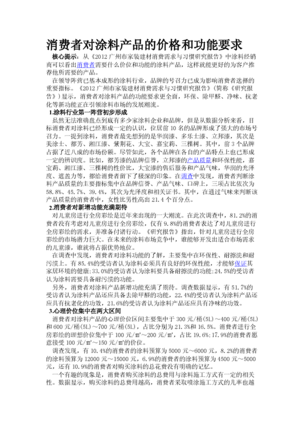 消費(fèi)者對(duì)涂料產(chǎn)品的價(jià)格和功能要求