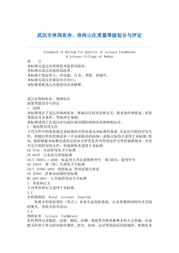 武漢市休閑農(nóng)舍、休閑山莊質(zhì)量等級(jí)劃分與評(píng)定