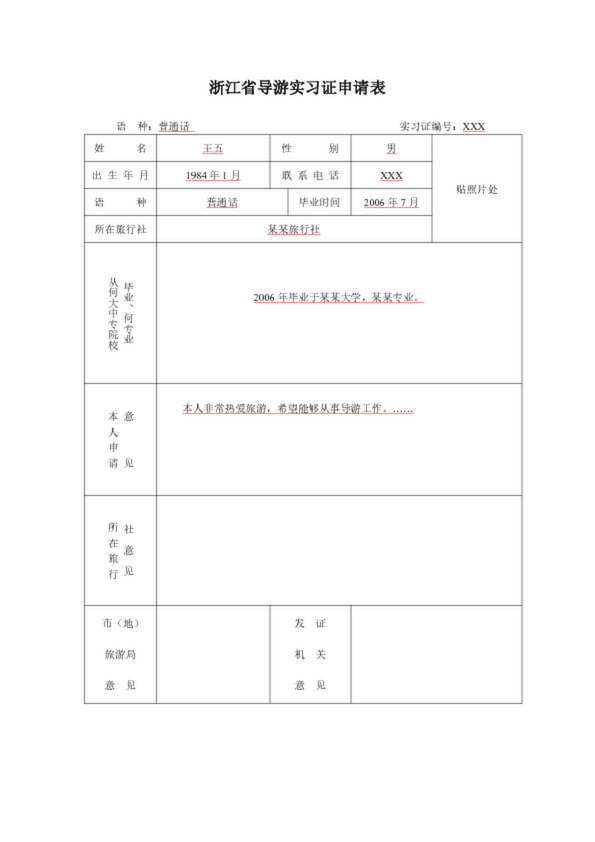浙江省導(dǎo)游實(shí)習(xí)證申請(qǐng)表