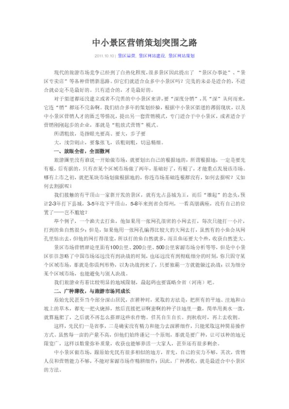 作為一個(gè)中小的旅游景區(qū),如何實(shí)現(xiàn)經(jīng)營(yíng)策略的突圍,我想應(yīng)從以下幾個(gè)方面入手。 ● 經(jīng)營(yíng)思路的突圍 作為一個(gè)旅游景區(qū)的經(jīng)營(yíng)者,必須有一個(gè)對(duì)企業(yè)發(fā)展戰(zhàn)略的遠(yuǎn)景...