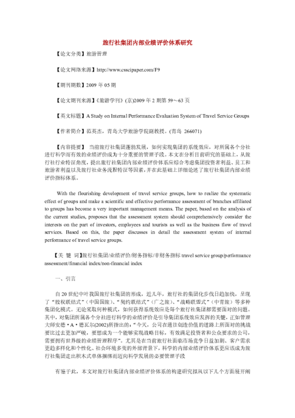 旅行社集團內(nèi)部業(yè)績評價體系研究,,如何實現(xiàn)集團的系統(tǒng)效應(yīng),對所屬各個分社進行科學(xué)而有效的業(yè)績評價成為十分重要的管理手段。本文在分析目前研究的基礎(chǔ)上,從旅行社行業(yè)...