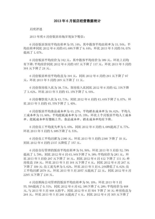 2013年6月飯店經(jīng)營數(shù)據(jù)統(tǒng)計(jì)