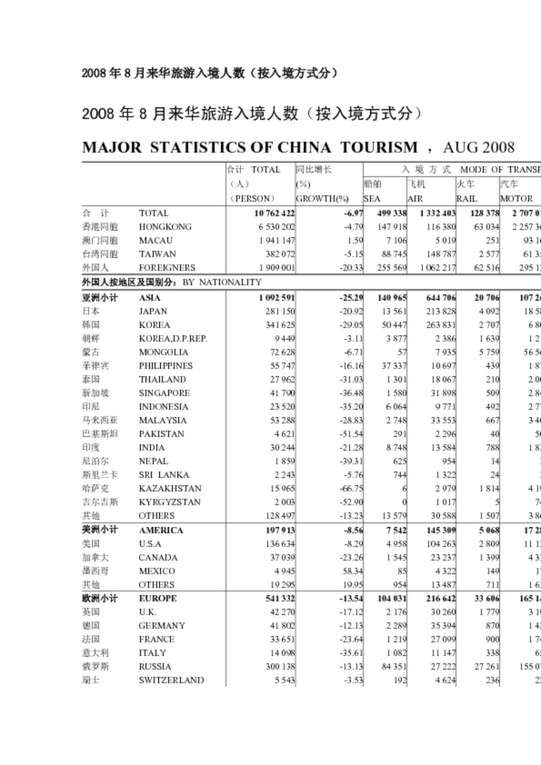 2008年8月來(lái)華旅游入境人數(shù)(按入境方式分)