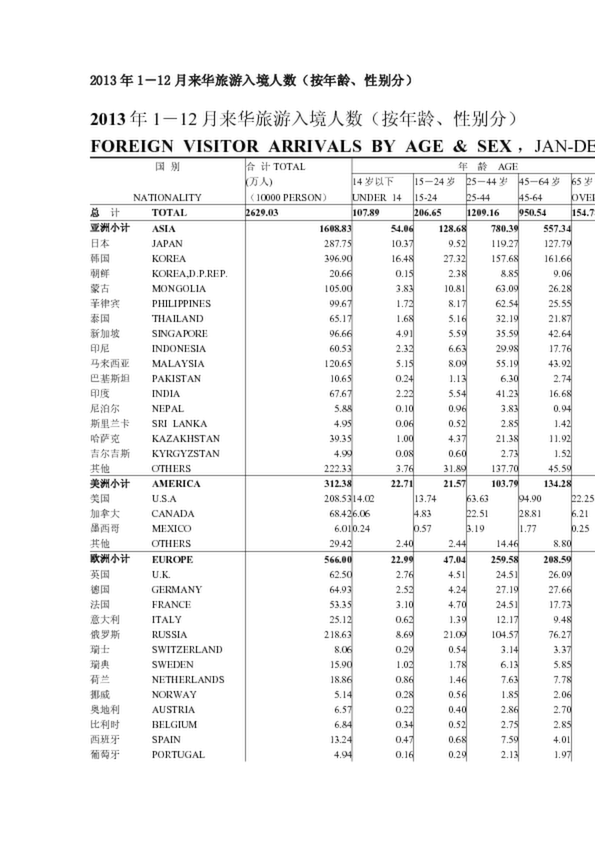 2013年1-12月來(lái)華旅游入境人數(shù)(按年齡、性別分)