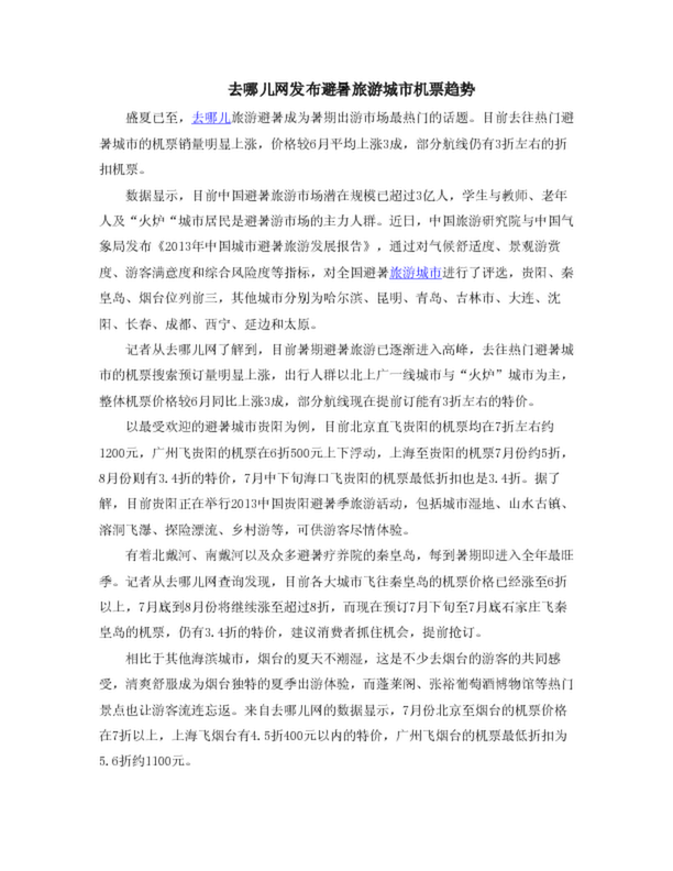 去哪兒網(wǎng)發(fā)布避暑旅游城市機(jī)票趨勢(shì)